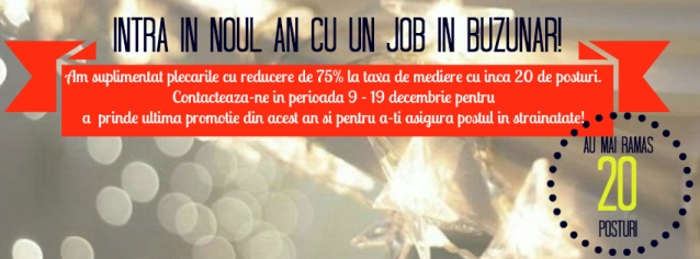 IMPORTANT: Promotia de reducere 75% la taxa de mediere a fost SUPLIMENTATA cu 20 de posturi, pentru perioada 9-19 decembrie 2013. Contacteaza-ne cel tarziu pana in data de 19 decembrie 2013, ora 12:00 pentru a-ti asigura postul in strainatate.